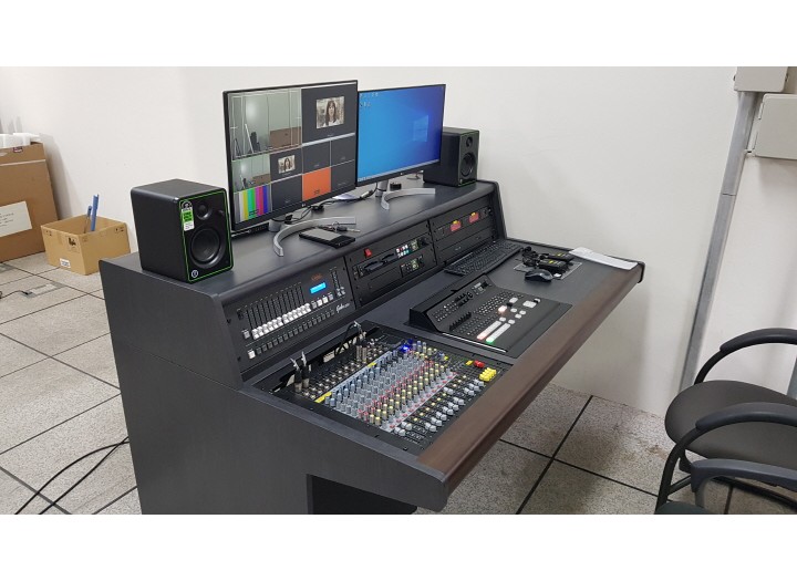 스튜디오 콘솔데스크에 4K 라이브 스위처, 오디오 믹서, 모니터 스피커, 4K 레코더, 4K 스트림 서버,