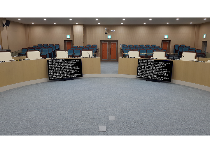 OO구의회 본회의장에 65인치 프롬프터 디스플레이 2대를 설치하였습니다.