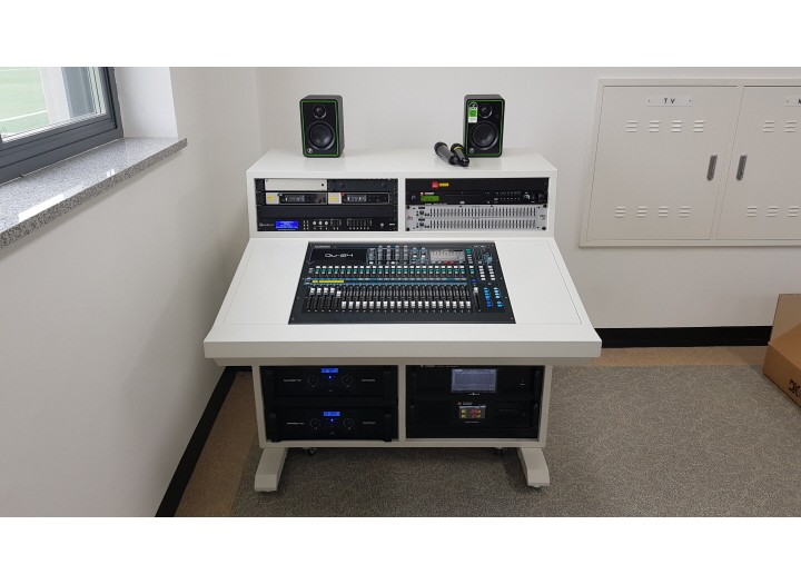 방송실 전용 데스크에 디지털 오디오 믹서 콘솔과 앰프, 무선마이크 수신기등을 설치하였습니다.