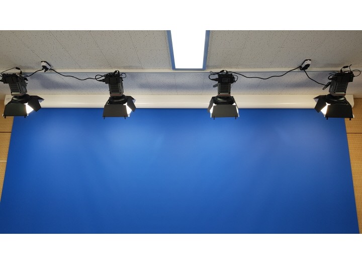 스튜디오에 200" 크로마 블루스크린을 설치하여 조정실의 Video Switcher에서