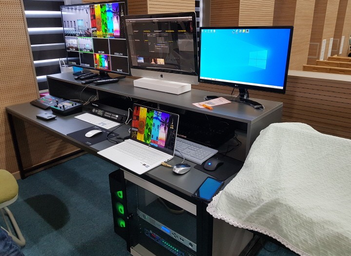 8채널 Live Switcher와 PTZ컨트롤러, 자막기, 녹화,편집 PC등 예배중 조작이 잦은 장비들은 1인의 운용 요원으로