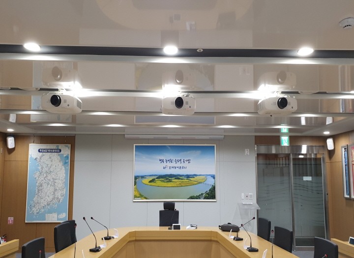 300인치 와이드 스크린과 Magic Glass Wall에 프로젝터 3대를 이용하여 상황에 따라 영상을 송출하고 있습니다.