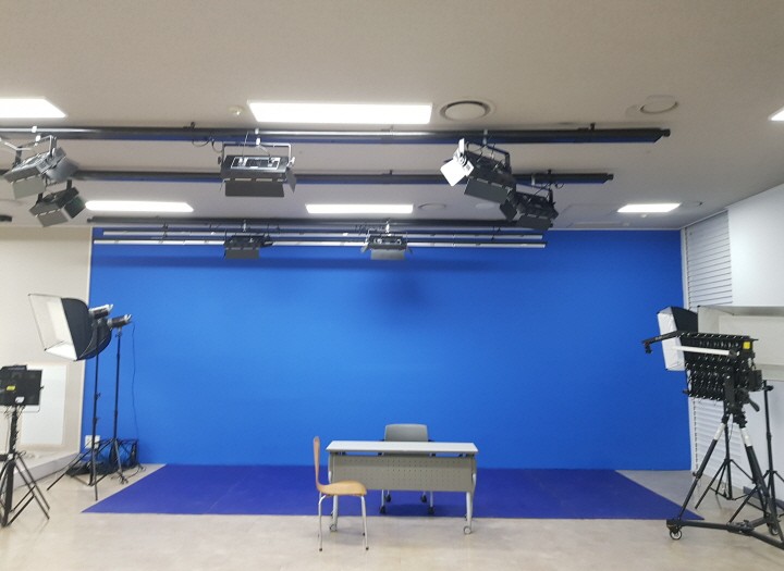 뉴스 스튜디오의 블루 스크린 및 데스크 모습