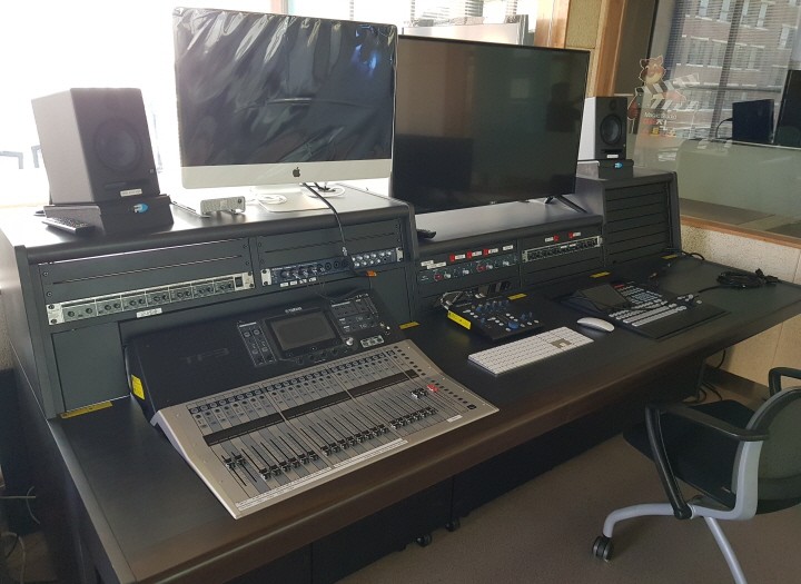 매직스튜디오 조정실에 5Bay 콘솔데스크를 설치하여 각종 영상장비 및 음향장비를 실장 하였습니다.