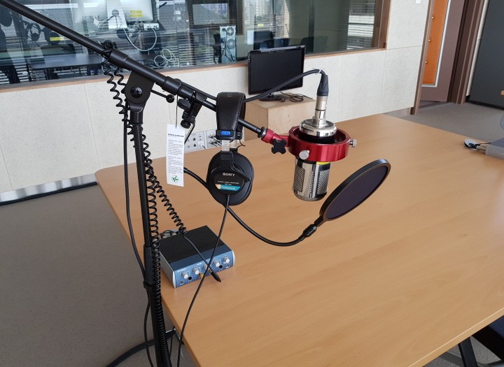 라디오 스튜디오에 고감도 콘덴서 마이크와 헤드폰, 앰프를 설치하여 고음질의 음원을 송출 할 수 있도록