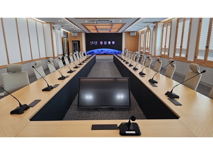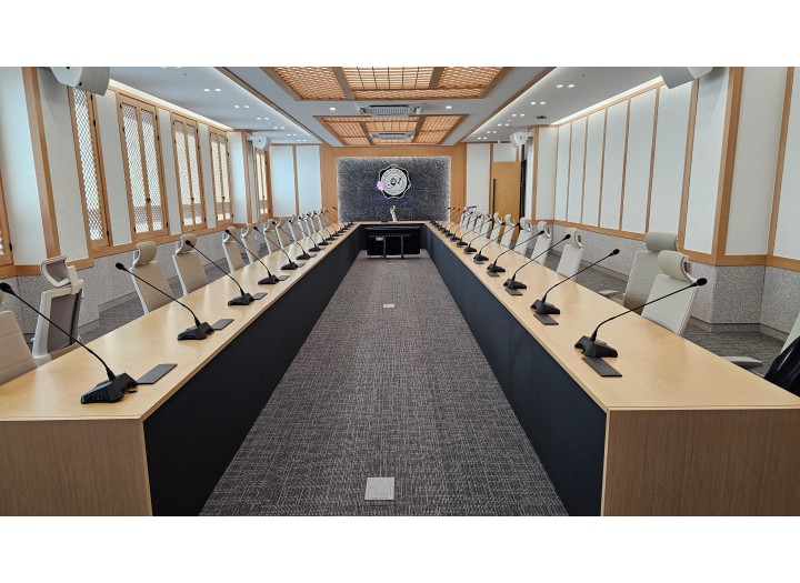 전체 의석에 디지털 회의용 마이크를 설치하였으며 스피커는 회의실의 크기를 고려하여 6개로 구성하였습니다.