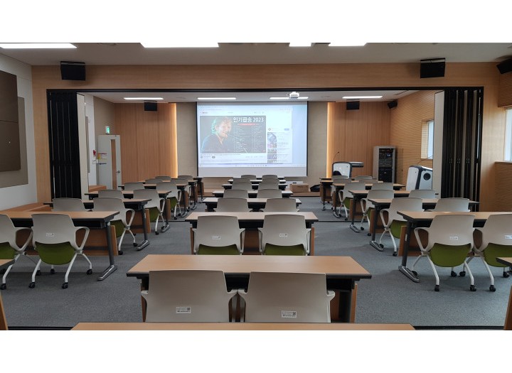 전자교탁에서 프로젝터, 스크린 오디오 출력 등 제어가 가능하고 프로젝터 미사용 행사 진행을 위해 음향시스템은 별도로