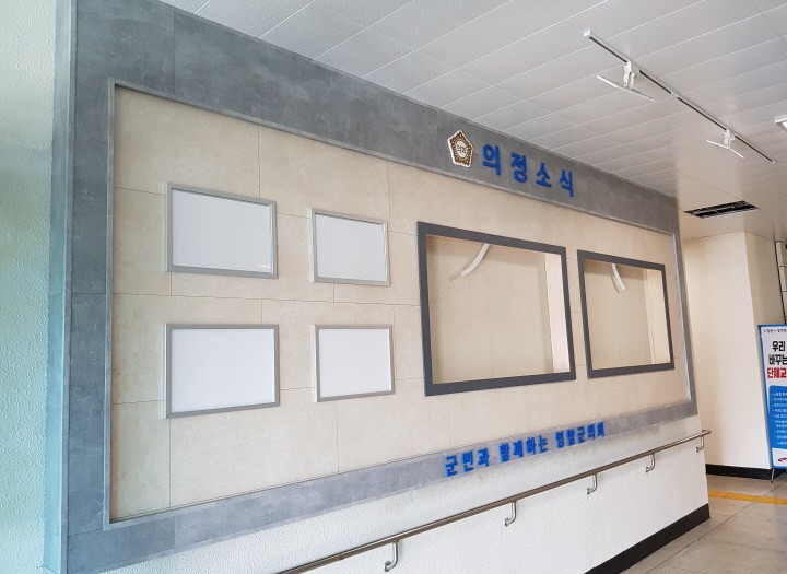전체적으로 밝은색 톤을 사용하였고 홍보사진 게시용 액자와