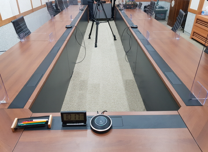 약 20여명 정도를 수용할 수 있는 중형급 회의실에서 온라인 화상회의시 구즈넥마이크 1개와